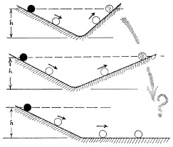 갈릴레이는 오른쪽 그림들과 같은 마찰을 최소한 곳에서 공 굴리는 실험하였는데, 왼쪽 경사 높이($h$)에서 공을 자연스럽게 놓는 경우, 오른쪽 경사의 기울기에 관계없이 항상 같은 높이 $h$에 도달한다는 것을 관찰. 그리고는 세번째 그림과 같이 오른쪽에 경사가 없는 경우에는 도달할 높이가 없으므로 무한정 굴러갈 수 밖에 없다는 결론을 내렸다고 한다. 즉 구르기 시작한 공은, 힘을(마찰과 같은 저항) 받지 않는 한, 영원히 구른다는 관성의 법칙을 세움.