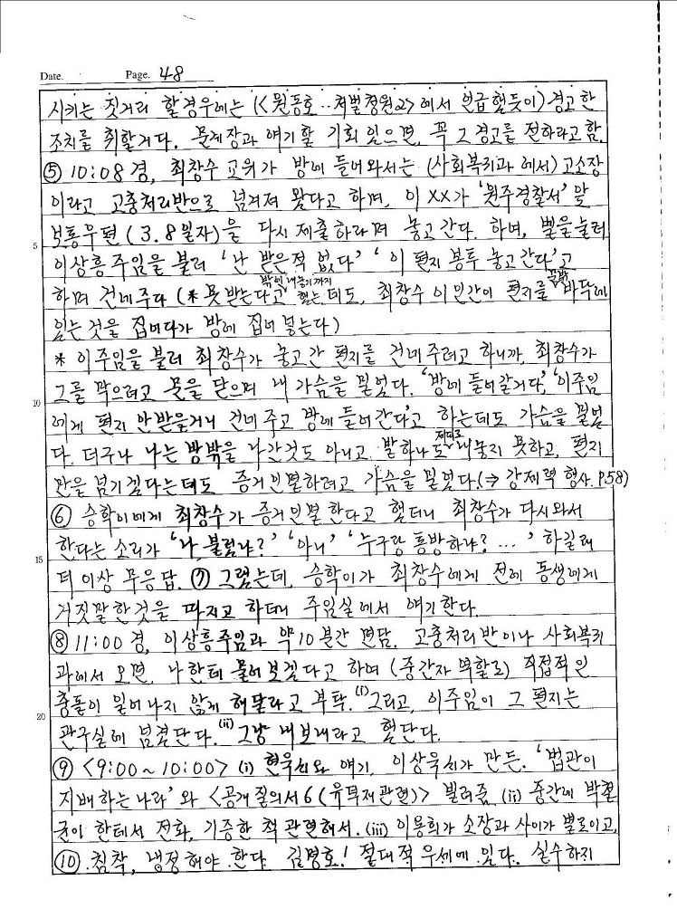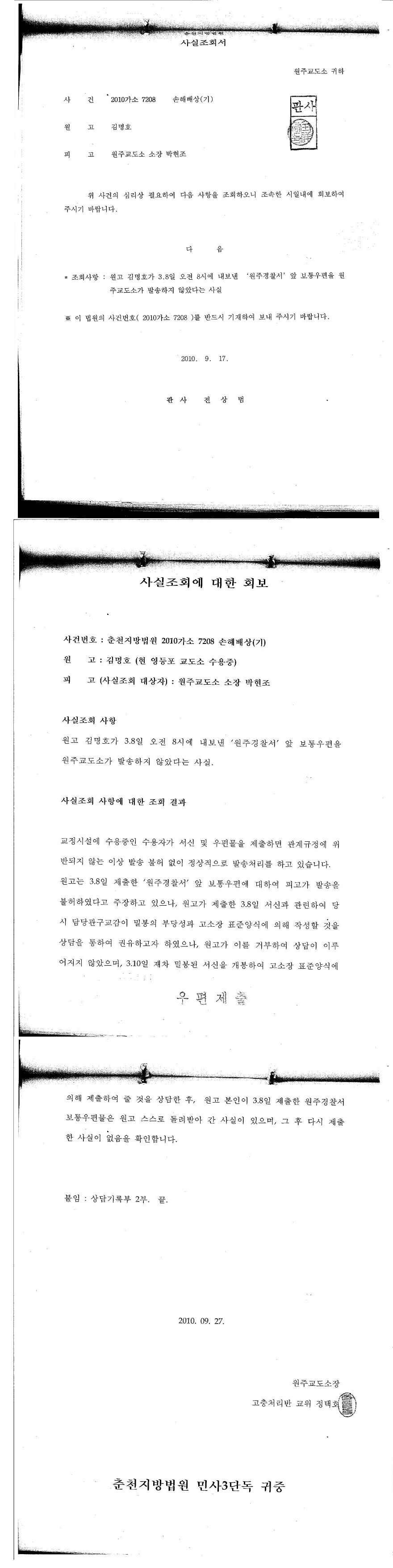 최창수 교위가 증거인멸하기 위하여 그 뜯겨진 서신을 내 던지고 갔고 원고는 이상흥 교위에게 다시 제출하였다. 그리고 그 고소장은 현재 행방불명, 즉 원주 경잘서에 접수되지도 않았으니 원주 교도소 놈들이 폐기시켜 버린 것.