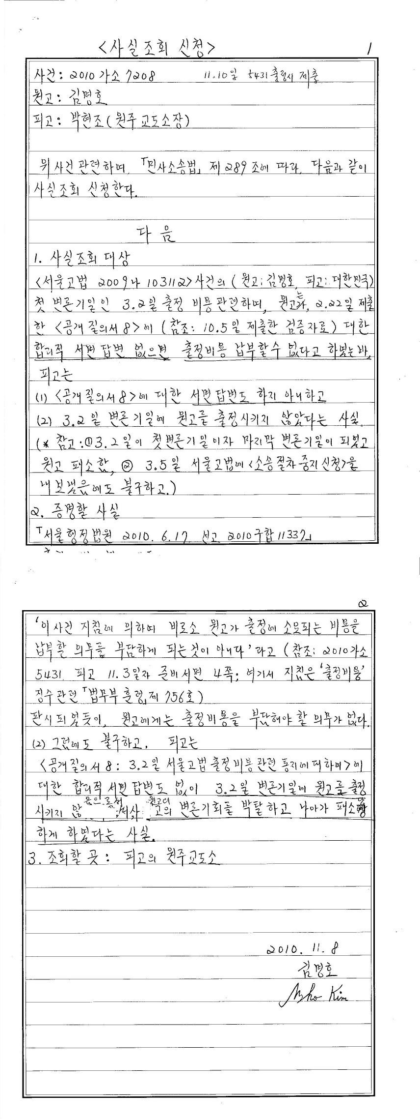 2010.11.10 원고 김명호 사실조회신청 제출