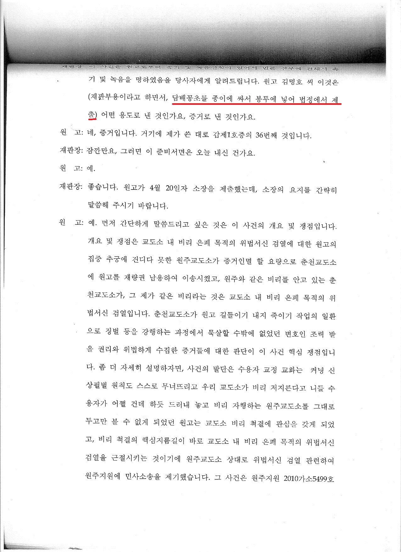김신유 이녀석이 참 한심한 게, 박원규 이 인간이 서신 위법 검열과는 아무런 관계도 없는 원고의 감옥생활 운운하고 자빠져 있는 것을 그냥 내버려 두고 있다. 보다 못해 원고가 지금 시간 낭비하고 있다 하니, 판단은 자기가 한다며 뒤 늦게 핵심요지를 얘기해달라고 한다.