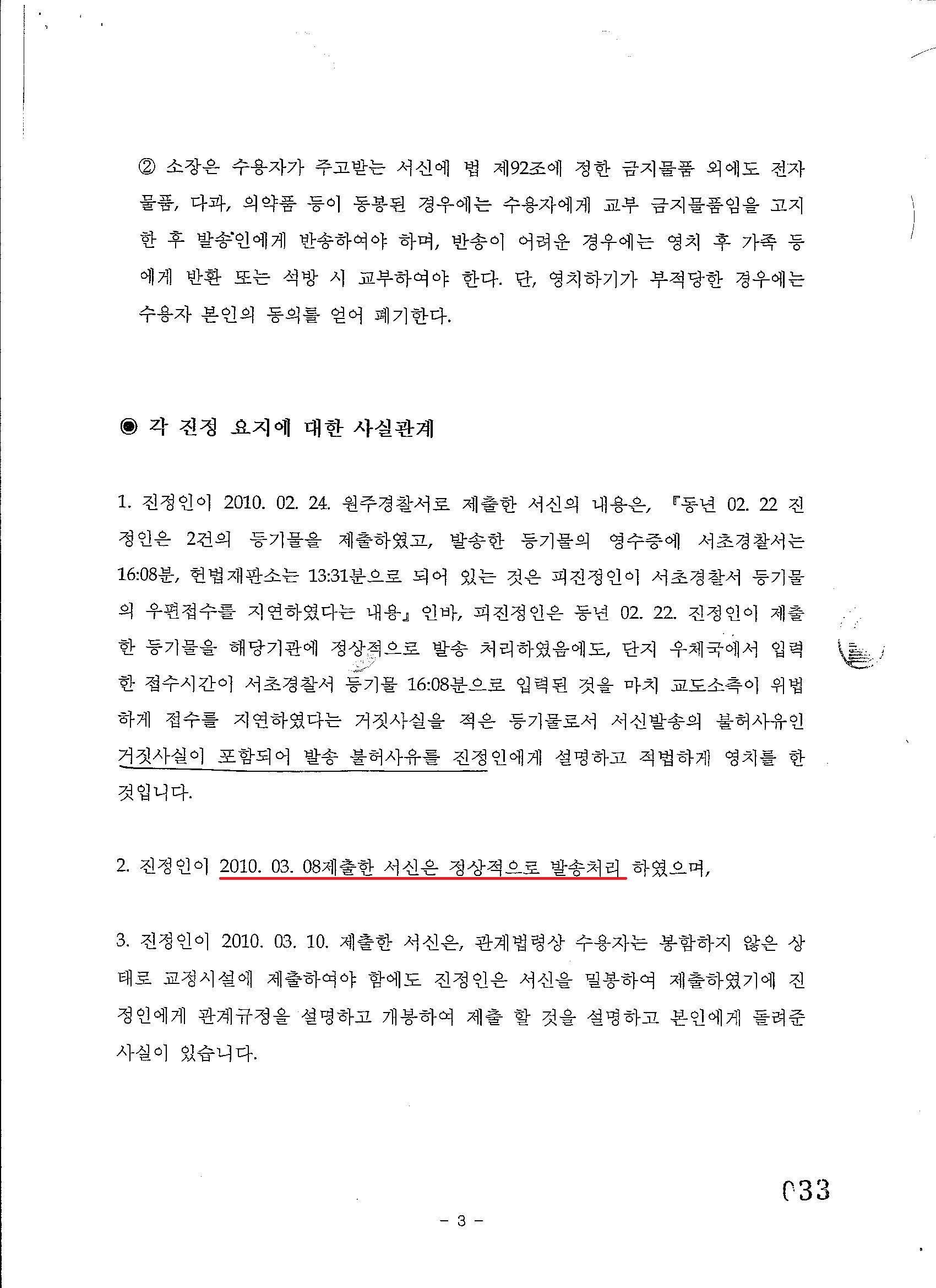 실상은 원동호 교도와 최창수 교위가 위법하게 뜯어 보고는, 2010년 3월 10일 오전 10시경