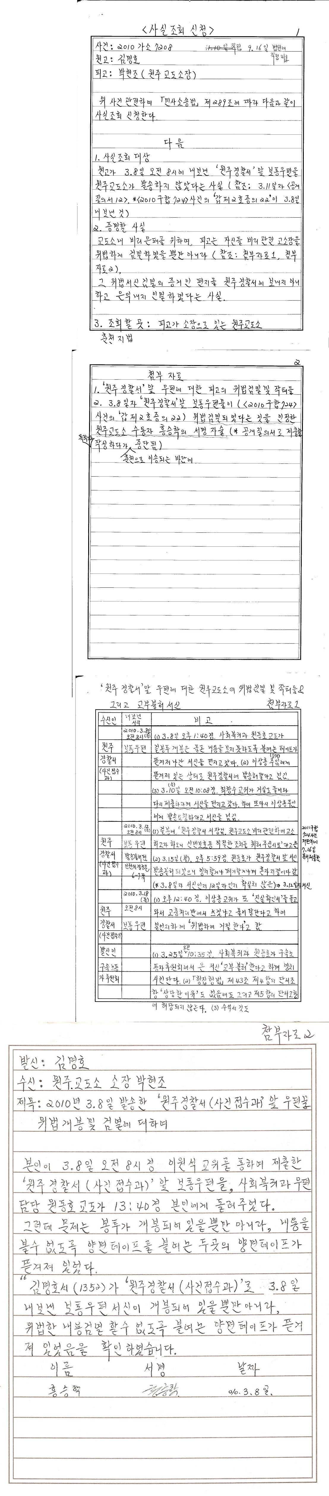 3. 참고로, 서신들과 함께 3.8일 함께 제출한 보고전(원주경찰서(사건접수과) 보통우편이 바로 '이복규에 대한 고소장'이고, 밑에 '교위 이원석 조간 근무자 제출'은 이상흥 교위가 확인 서명한것)