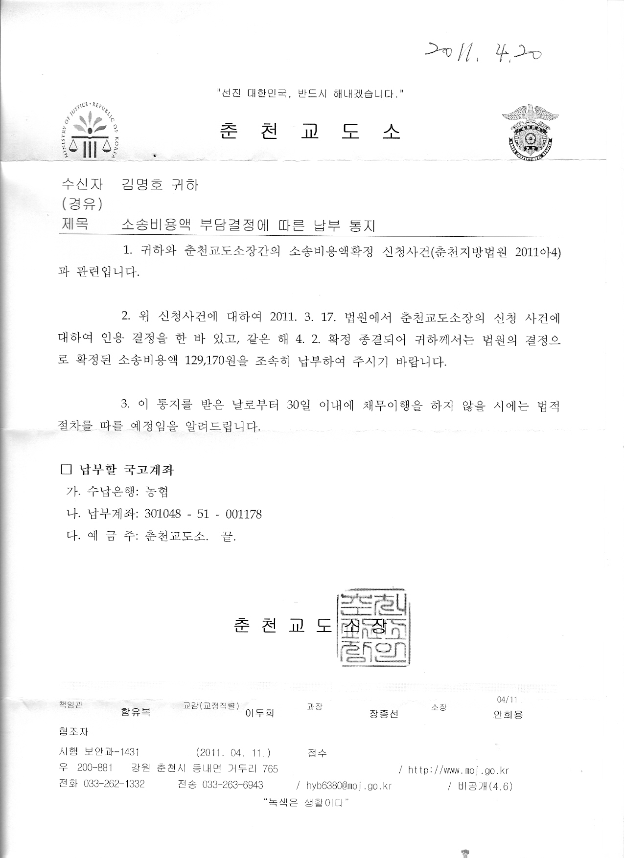 2011. 4. 20 뻔뻔한 춘천교도소의 적반하장의 협박