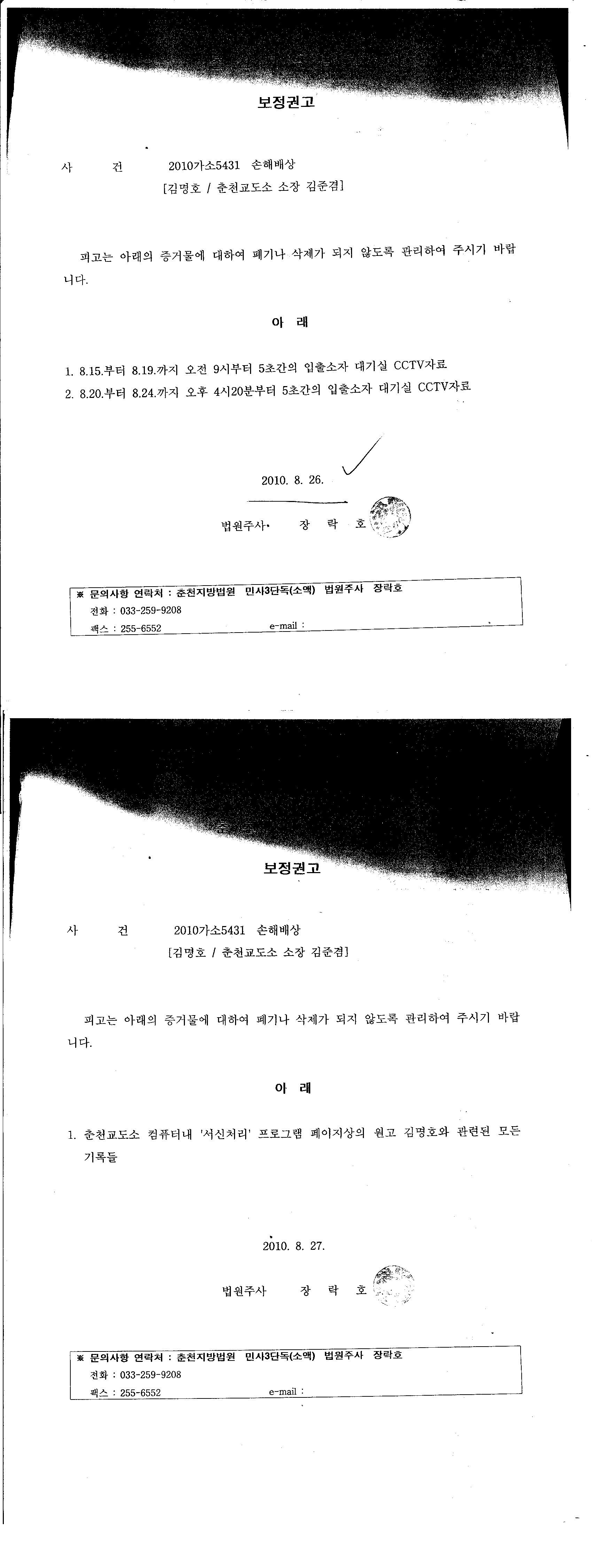 춘천교도소에 보존명령을 내림과 동시에 원고에게 검증 비용에 대한