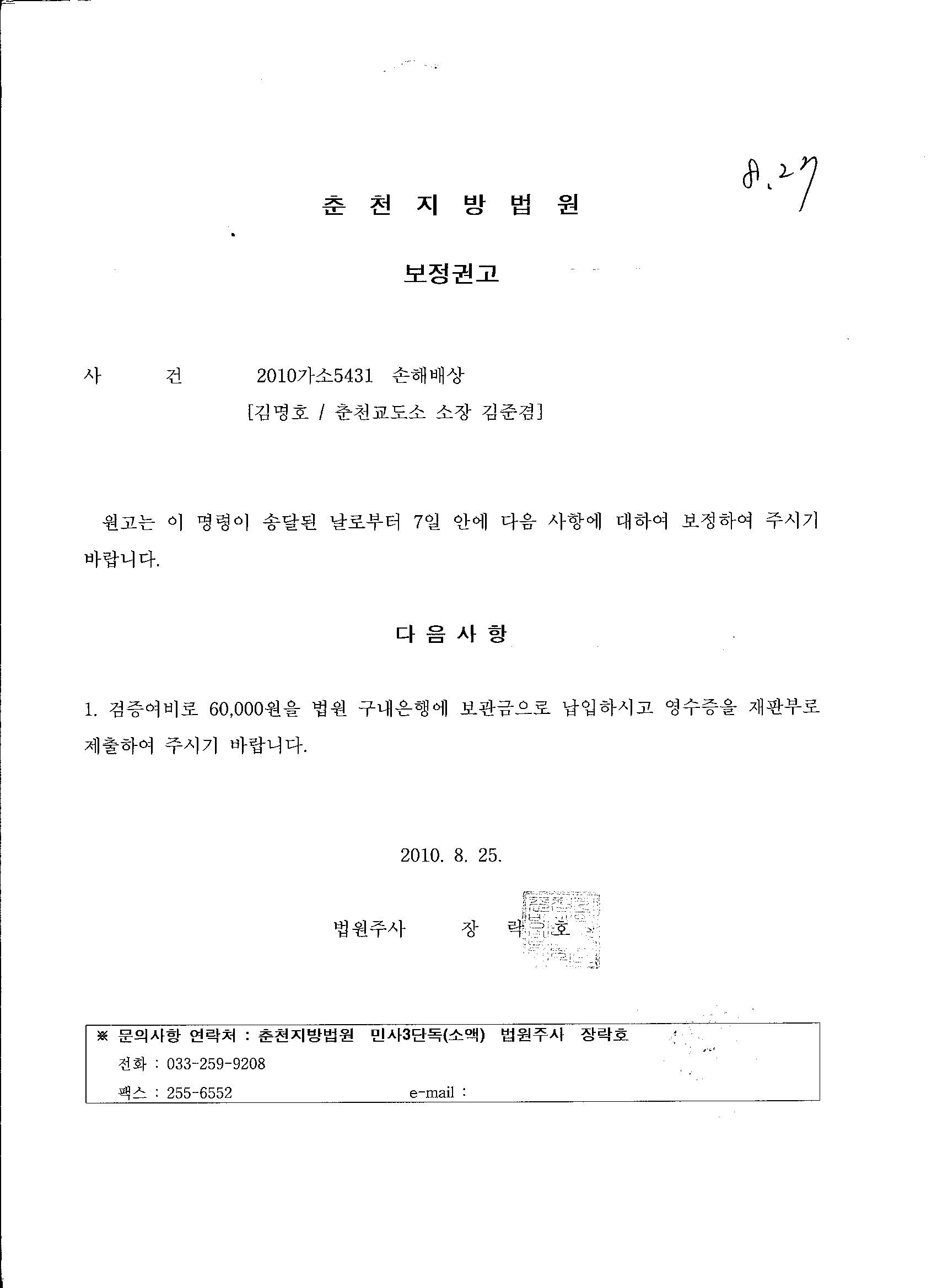 2010. 5. 4 징벌집행정지 신청 보정명령의 고의적인 지연 도달(*긴급을 요하는 일에 이 따위 보정명령으로 시간이나 잡아먹는 작태는 생명위독한 환자에게 응급조치 취하지 아니하고 입원비 부터 내라는 의사놈들하고 다름없는 범죄행위!)