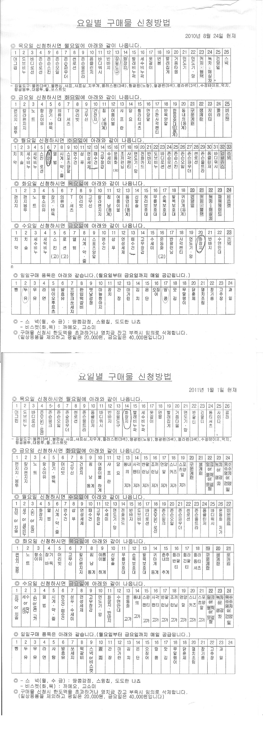 영등포 교도소 요일별 구매신청표