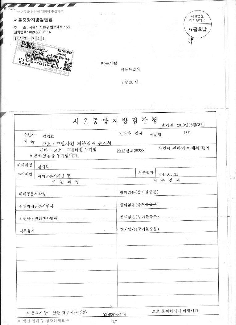 그 지랄을 떨더니 개만도 못한 김남수 검사새끼의 특별지시를 받았는지, 불기소 통지.