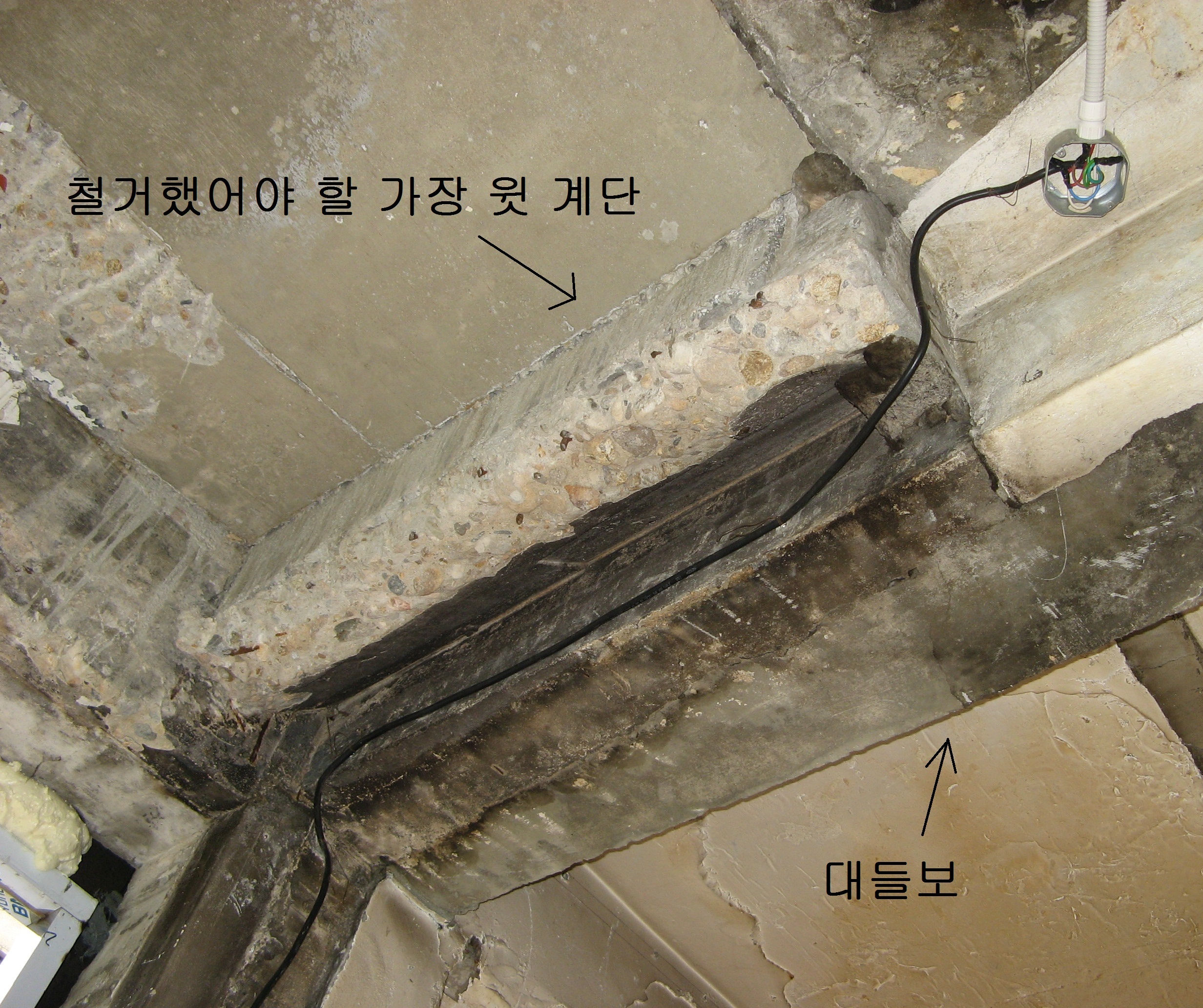 1. 공사 중 일부가 계단을 옮기는 작업이었는데, 오른쪽 사진을 보면 마지막 윗 계단을 깨끗하게 철거하지 않았다. '왜? 철거하지 않았냐?'고 했더니 구조상 대들보를 받쳐주기 때문이라는 어처구니 없는 답변을 하였다. 대들보를 받쳐주어야 한다면 미관상 보기 안 좋은 마지막 계단을 깨끗하게 철거하고(주: 천장 노출의 수선) H 빔으로 받쳐주어야 하는 것이 공사 감독이 취해야 할 조치가 아닌가?