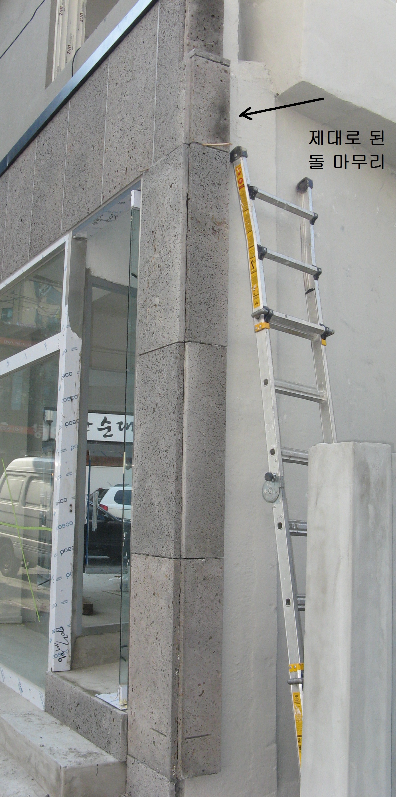 8. 돌을 붙이는 공사에서 돌을 벽에다 붙일 때에는 스티로폼 또는 단열재로 싸고 나서 그 위에 돌을 붙여야 함에도 불구하고 그냥 벽위에 돌을 붙임으로 써, 단열은 커녕 주먹으로 치기만 해도 돌이 깨지도록 방치.