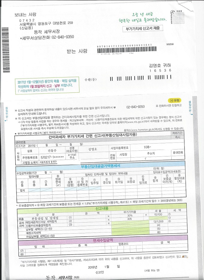 '부가가치세 신고서' 받지 못했다고 하니, 금년에는 보내지 않았다고 한다(세무서장 고영호). 부아가 확 치민다.