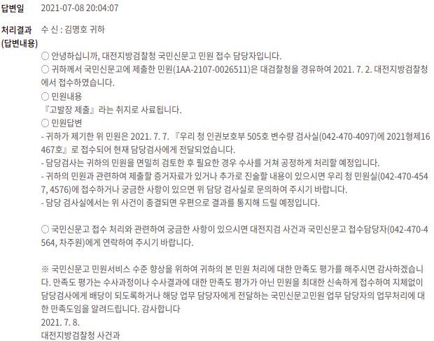 [2021. 7.1] 공무원 종년놈들의 서로 감싸기, 범인도피죄 고발(국민신문고 1AA-2107-0026511, 처리기관 대검찰청)