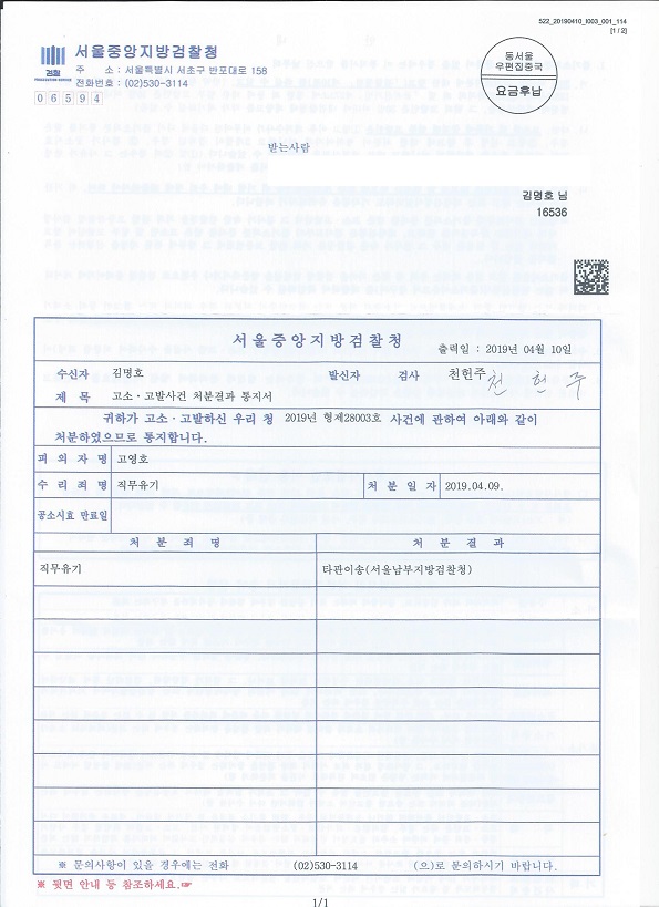 [2019. 4.15] 서울중앙지검 천헌주, 고영호 고발사건 남부로 위법 이송