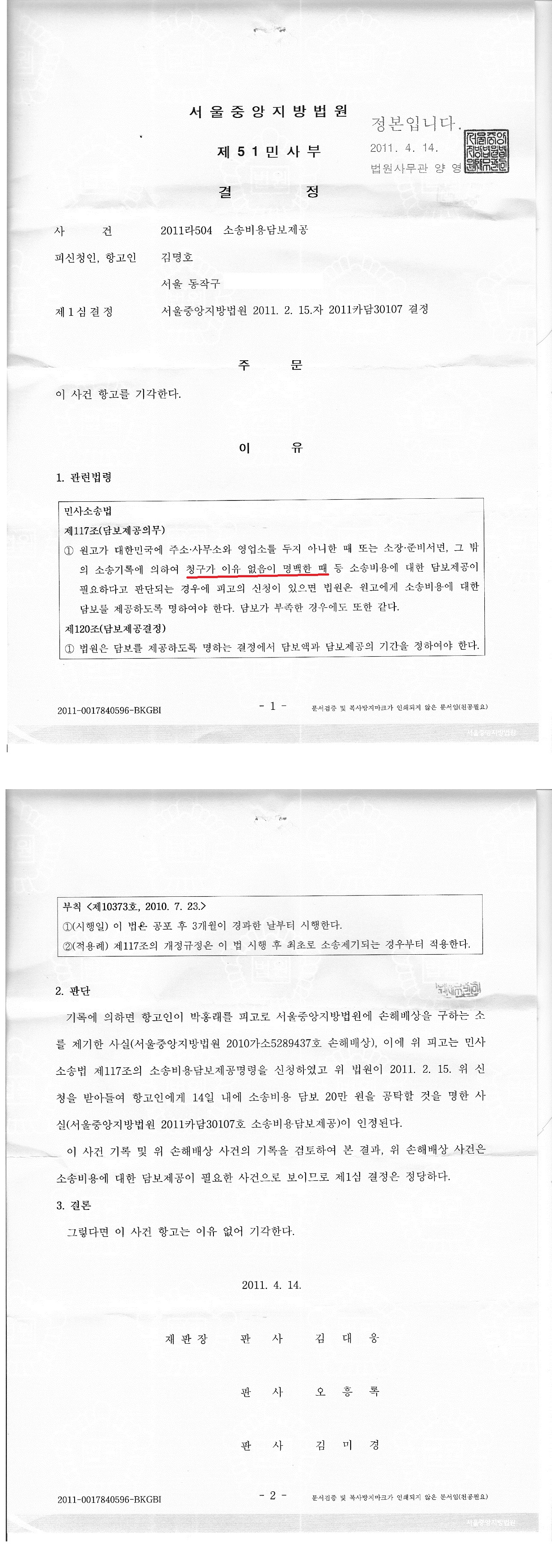 “7개월만 일사천리 재판”…문재인 “‘죽여달라’ 최악저질", Newsface, 기사입력 2011-10-24 민성일 기자)