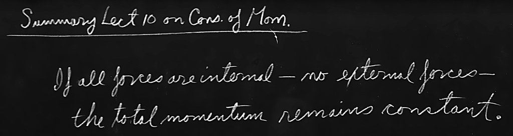 Now what are the interesting consequences of the above relationship? Suppose, for simplicity, that we have just two interacting particles, possibly of different mass, and numbered $1$ and $2$. The forces between them are equal and opposite; what are the consequences? According to Newton’s Second Law, force is the time rate of change of the momentum, so we conclude that the rate of change of momentum $p_1$ of particle $1$ is equal to minus the rate of change of momentum $p_2$ of particle $2$, or \begin{equation} \label{Eq:I:10:1} dp_1/dt=-dp_2/dt. \end{equation} Now if the rate of change is always equal and opposite, it follows that the total change in the momentum of particle $1$ is equal and opposite to the total change in the momentum of particle $2$; this means that if we add the momentum of particle $1$ to the momentum of particle $2$, the rate of change of the sum of these, due to the mutual forces (called internal forces) between particles, is zero; that is \begin{equation} \label{Eq:I:10:2} d(p_1+p_2)/dt=0. \end{equation} There is assumed to be no other force in the problem. If the rate of change of this sum is always zero, that is just another way of saying that the quantity $(p_1+p_2)$ does not change. (This quantity is also written $m_1v_1+m_2v_2$, and is called the total momentum of the two particles.) We have now obtained the result that the total momentum of the two particles does not change because of any mutual interactions between them. This statement expresses the law of conservation of momentum in that particular example. We conclude that if there is any kind of force, no matter how complicated, between two particles, and we measure or calculate $m_1v_1+m_2v_2$, that is, the sum of the two momenta, both before and after the forces act, the results should be equal, i.e., the total momentum is a constant.