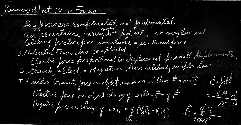 For example, if we were to choose to say that an object left to itself keeps its position and does not move, then when we see something drifting, we could say that must be due to a “gorce”—a gorce is the rate of change of position. Now we have a wonderful new law, everything stands still except when a gorce is acting. You see, that would be analogous to the above definition of force, and it would contain no information. The real content of Newton’s laws is this: that the force is supposed to have some independent properties, in addition to the law $F=ma$; but the specific independent properties that the force has were not completely described by Newton or by anybody else, and therefore the physical law $F=ma$ is an incomplete law. It implies that if we study the mass times the acceleration and call the product the force, i.e., if we study the characteristics of force as a program of interest, then we shall find that forces have some simplicity; the law is a good program for analyzing nature, it is a suggestion that the forces will be simple.