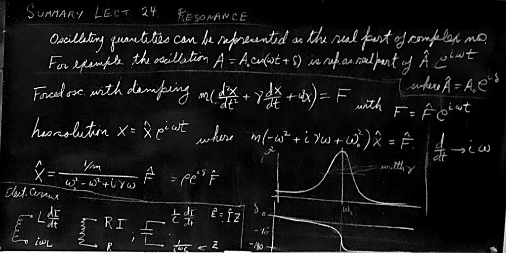 Now we have the equation in the most convenient form to solve. If $\gamma$ is very small, that represents very little friction; if $\gamma$ is very large, there is a tremendous amount of friction. How do we solve this new linear differential equation? Suppose that the driving force is equal to $F_0\cos\,(\omega t+\Delta)$; we could put this into (23.6a) and try to solve it, but we shall instead solve it by our new method. Thus we write $F$ as the real part of $\hat{F}e^{i\omega t}$ and $x$ as the real part of $\hat{x}e^{i\omega t}$, and substitute these into Eq. (23.6a). It is not even necessary to do the actual substituting, for we can see by inspection that the equation would become \begin{equation} \label{Eq:I:23:7} [(i\omega)^2\hat{x}+\gamma(i\omega)\hat{x}+\omega_0^2\hat{x}] e^{i\omega t}=(\hat{F}/m)e^{i\omega t}. \end{equation} [As a matter of fact, if we tried to solve Eq. (23.6a) by our old straightforward way, we would really appreciate the magic of the “complex” method.] If we divide by $e^{i\omega t}$ on both sides, then we can obtain the response $\hat{x}$ to the given force $\hat{F}$; it is \begin{equation} \label{Eq:I:23:8} \hat{x}=\hat{F}/m(\omega_0^2-\omega^2+i\gamma\omega). \end{equation}