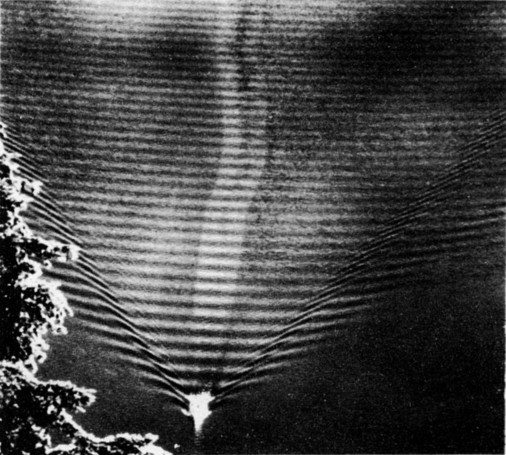 The corresponding circumstances in the case of sound are illustrated in Fig. 51–2, which is a photograph of an object moving through a gas at a speed greater than the speed of sound. The changes in pressure produce a change in refractive index, and with a suitable optical system the edges of the waves can be made visible. We see that the object moving faster than the speed of sound does, indeed, produce a conical wave. But closer inspection reveals that the surface is actually curved. It is straight asymptotically, but it is curved near the apex, and we have now to discuss how that can be, which brings us to the second topic of this chapter.