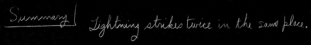 But we are still not finished. After a time of, perhaps, a few hundredths of a second, when the return stroke has disappeared, another leader comes down. But this time there are no pauses. It is called a “dart leader” this time, and it goes all the way down—from top to bottom in one swoop. It goes full steam on exactly the old track, because there is enough debris there to make it the easiest route. The new leader is again full of negative charge. The moment it touches the ground—zing!—there is a return stroke going straight up along the path. So you see the lightning strike again, and again, and again. Sometimes it strikes only once or twice, sometimes five or ten times—once as many as $42$ times on the same track was seen—but always in rapid succession.