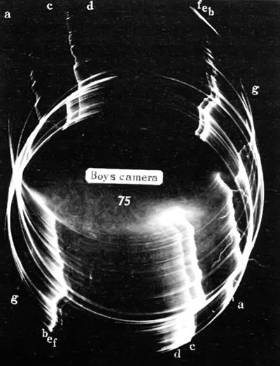 The first evidence of what happens in a lightning stroke was obtained in photographs taken with a camera held by hand and moved back and forth with the shutter open—while pointed toward a place where lightning was expected. The first photographs obtained this way showed clearly that lightning strokes are usually multiple discharges along the same path. Later, the “Boys” camera, which has two lenses mounted $180^\circ$ apart on a rapidly rotating disc, was developed. The image made by each lens moves across the film—the picture is spread out in time. If, for instance, the stroke repeats, there will be two images side by side. By comparing the images of the two lenses, it is possible to work out the details of the time sequence of the flashes. Figure 9–14 shows a photograph taken with a “Boys” camera.