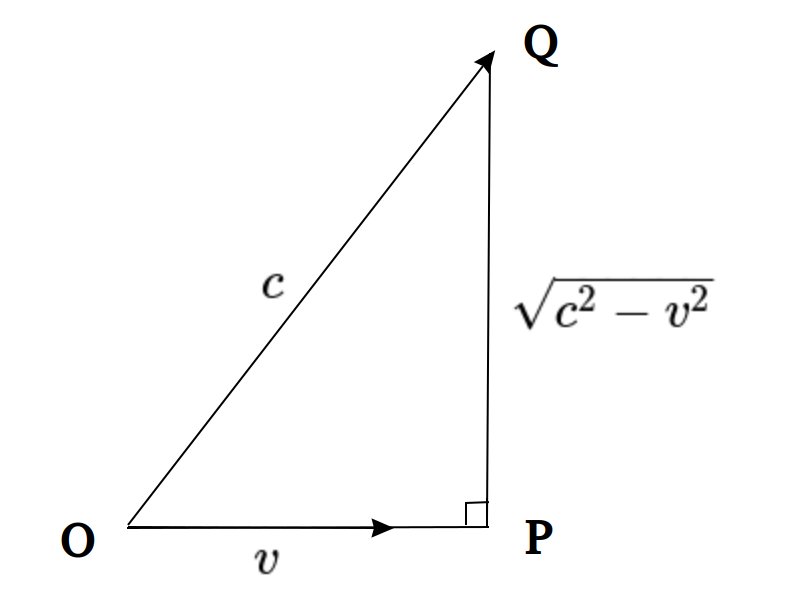 길이 형성하는 기 양은 일정하니, $v$ 방향 기양 $\times$ PQ 방향 기양= 일정, $v$ 방향 변화율은 PQ 방향으로 늘어난 기 변화율의 역, 즉 길이는 $1/\sqrt{1-v^2/c^2}$배로 줄어든다는 거