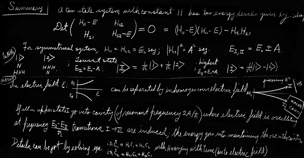 To begin with, we write down the equations to be solved: \begin{equation} \begin{aligned} i\hbar\,\ddt{C_1}{t}&=(E_0+\mu\Efield)C_1-AC_2,\\[1ex] i\hbar\,\ddt{C_2}{t}&=-AC_1+(E_0-\mu\Efield)C_2. \end{aligned} \label{Eq:III:9:36} \end{equation} To be definite, let’s suppose that the electric field varies sinusoidally; then we can write \begin{equation} \label{Eq:III:9:37} \Efield=2\Efield_0\cos\omega t= \Efield_0(e^{i\omega t}+e^{-i\omega t}). \end{equation} In actual operation the frequency $\omega$ will be very nearly equal to the resonant frequency of the molecular transition $\omega_0=2A/\hbar$, but for the time being we want to keep things general, so we’ll let it have any value at all. The best way to solve our equations is to form linear combinations of $C_1$ and $C_2$ as we did before. So we add the two equations, divide by the square root of $2$, and use the definitions of $C_{\slI}$ and $C_{\slII}$ that we had in Eq. (9.13). We get \begin{equation} \label{Eq:III:9:38} i\hbar\,\ddt{C_{\slII}}{t}= (E_0-A)C_{\slII}+\mu\Efield C_{\slI}. \end{equation} You’ll note that this is the same as Eq. (9.9) with an extra term due to the electric field. Similarly, if we subtract the two equations (9.36), we get \begin{equation} \label{Eq:III:9:39} i\hbar\,\ddt{C_{\slI}}{t}= (E_0+A)C_{\slI}+\mu\Efield C_{\slII}. \end{equation}