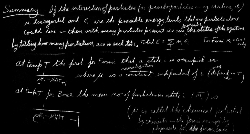 We have gone through a rather long-winded argument to tell you a simple thing. When you don’t take into account any interaction between particles, you can think of each particle independently. They can individually exist in the various different states they would have alone, and they will each contribute the energy they would have had if they were alone. However, you must remember that if they are identical particles, they may behave either as Bose or as Fermi particles depending upon the problem. Two extra electrons added to a crystal, for instance, would have to behave like Fermi particles. When the positions of two electrons are interchanged, the amplitude must reverse sign. In the equation corresponding to Eq. (15.24) there would have to be a minus sign between the two terms on the right. As a consequence, two Fermi particles cannot be in exactly the same condition—with equal spins and equal $k$’s. The amplitude for this state is zero.