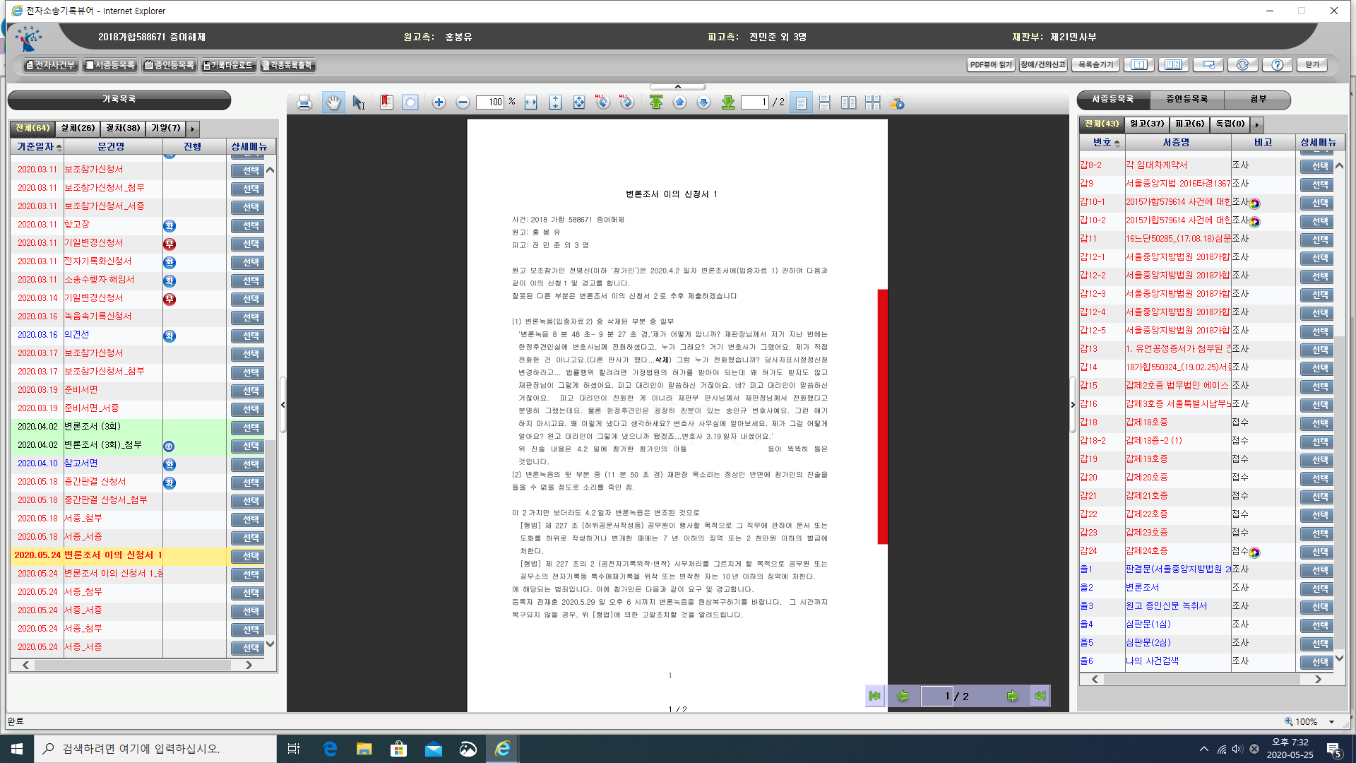 피고측 변호사 이현곤이 '당사자본인신문 신청서'(26일), '이의신청서'(27일) 제출한 것 밖에 없는데...