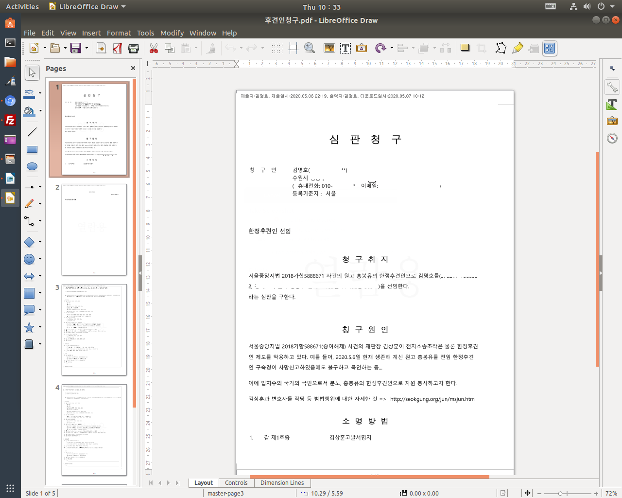 아주 재미있는 것은, 로고 없는 소장에서 피고들 이름과 주소를 삭제하기 위해 'LibreOffice Draw'라는 프로그램으로 열었더니
