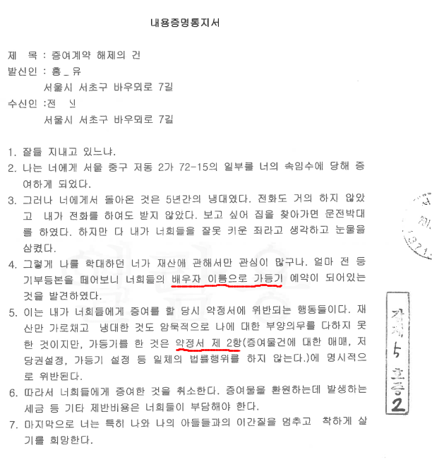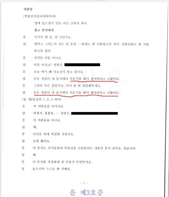 '모든 것들이 내 등기에다 가등기를 해서 찾아달라고 나왔어요'라며 '약정서 제2항' 위반을 명확하게 지적 답변함으로써 말이다