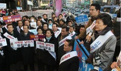 다시 한 번 생각한다. ‘한나라당이 무엇 때문에 저토록 사학법에 목을 매는가?’ 15년 동안 사학법 개정을 가로막은 것도 모자라 사학법이 우여곡절 끝에 개정되자 국회를 완전 거부하면서 길거리에 나서서 악다구니를 부리던 그들. 그것도 모자라 1년 동안 국회를 절름발이로 만들더니 1,000건이 넘는 법안을 국회에 잠재워 둔 채 또 다시 헌법을 위반하면서까지 예산안 처리를 거부하여 개점 휴업상태로 만들어버린 그들의 행태는 이제 국회의원이라기보다는 조폭의 그것에 가깝다. 헌법 위에 있다는 그들 한나라당 ‘떼법’의 진수를 보여주는 것이고, 한나라당의 조폭정치의 현주소를 적나라하게 보여주는 장면이다. 도대체 새해 예산안과 사학법이, 로스쿨법과 사학법이 무슨 논리적 연관성이 있다는 말인가? 다시 왜 그들이 그토록 사학법에 목을 매는가를 돌아보게 된다.