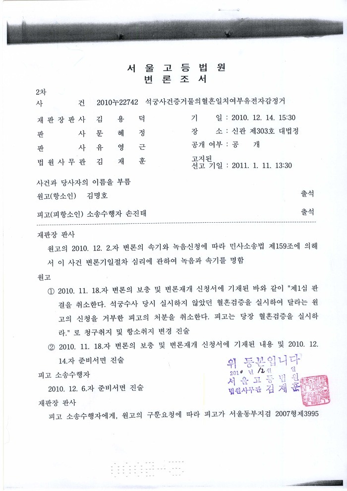 석궁사건 수사 당시, 박홍우 옷가지 혈흔과 박홍우 피의 일치 여부에 대하여 유전자 감정을 하였느냐에 대하여 김용덕이 묻는데, 피고 대리인 손진태가 한다는 소리를 보라. 그저 어떻게 하면 듣는 사람이 헷갈리게 '유전자 감정은 했다. 이 행정사건 관련하여 한 것은 없다.'라고 대답을 회피하는 뺀질함을 보이고 있다.