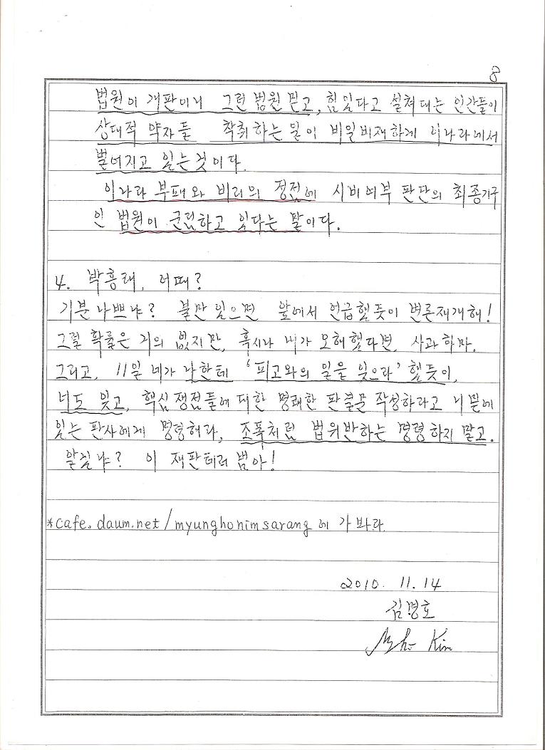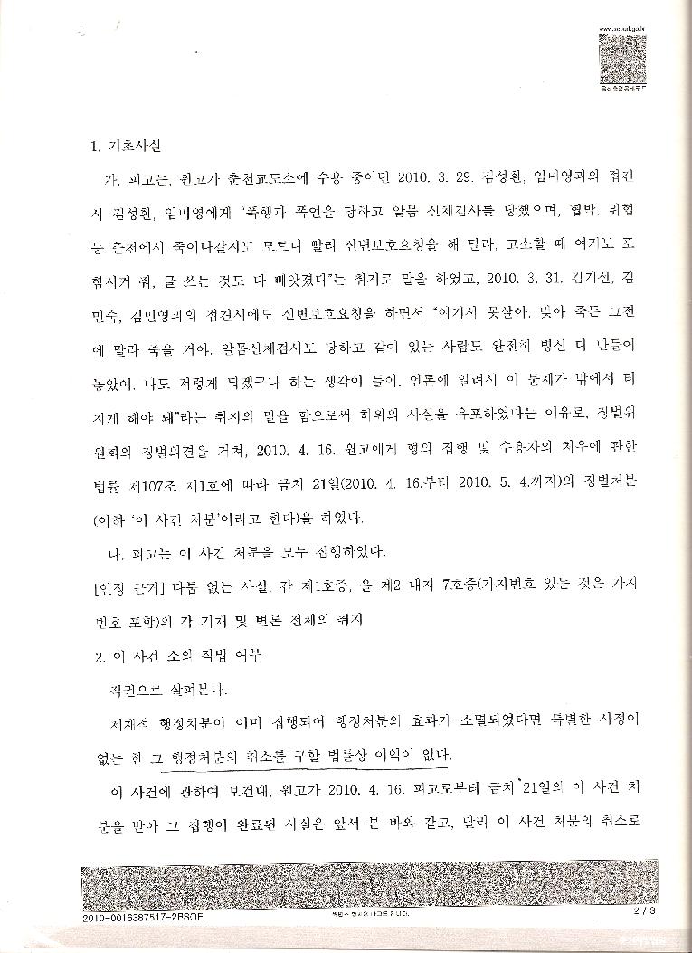 1. 변론 종결 일(2010. 11.11일 목요일) 박홍래의 하는 꼬락서니를 보고 '징벌 취소의 이익이 없다'는 이유로 각하할 것을 예측하고 보낸, 2010.11.17일경고장(비교: 성대출신 강영호 배정할 것을 예측하고 보낸 민원, 법원 양아치 새끼들 하는 짓이 이렇게 속 들여다 보이는 짓을 대놓고 한다)