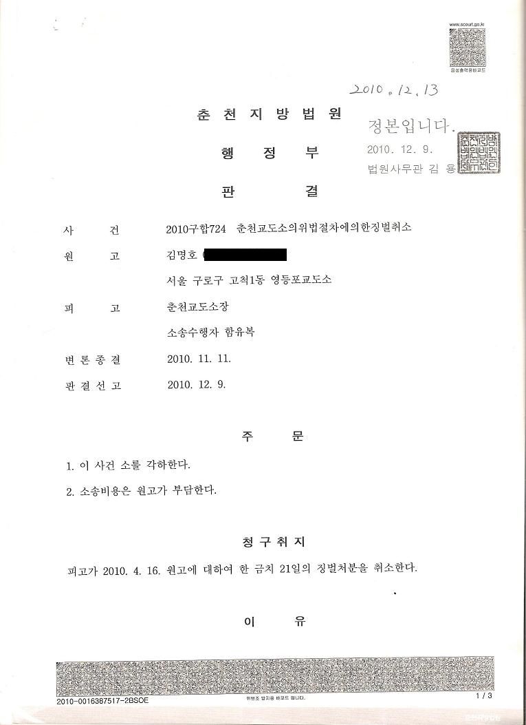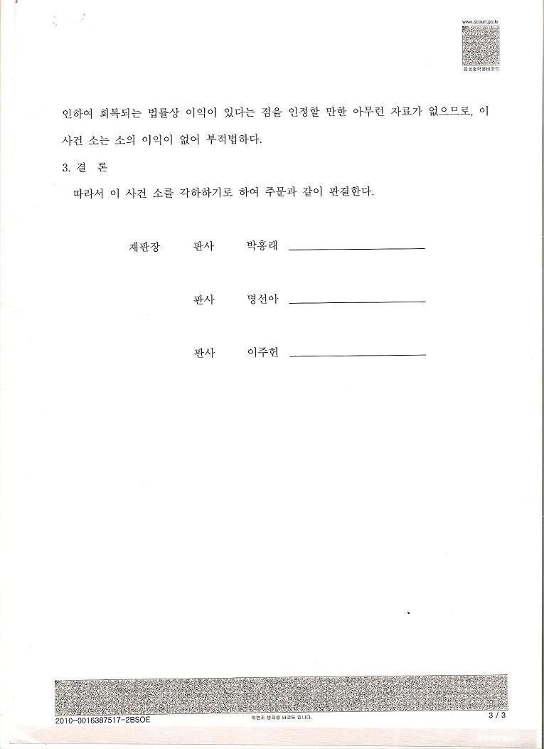 2. 위 경고에도 불구하고, 2010. 12.9일, 박홍래는 '징벌취소의 이익이 있다는 입증자료가 없다'는 개소리로 기어이 각하시키는 재판테러 강행, 전형적인 재판테러범의 모범을 보였다.