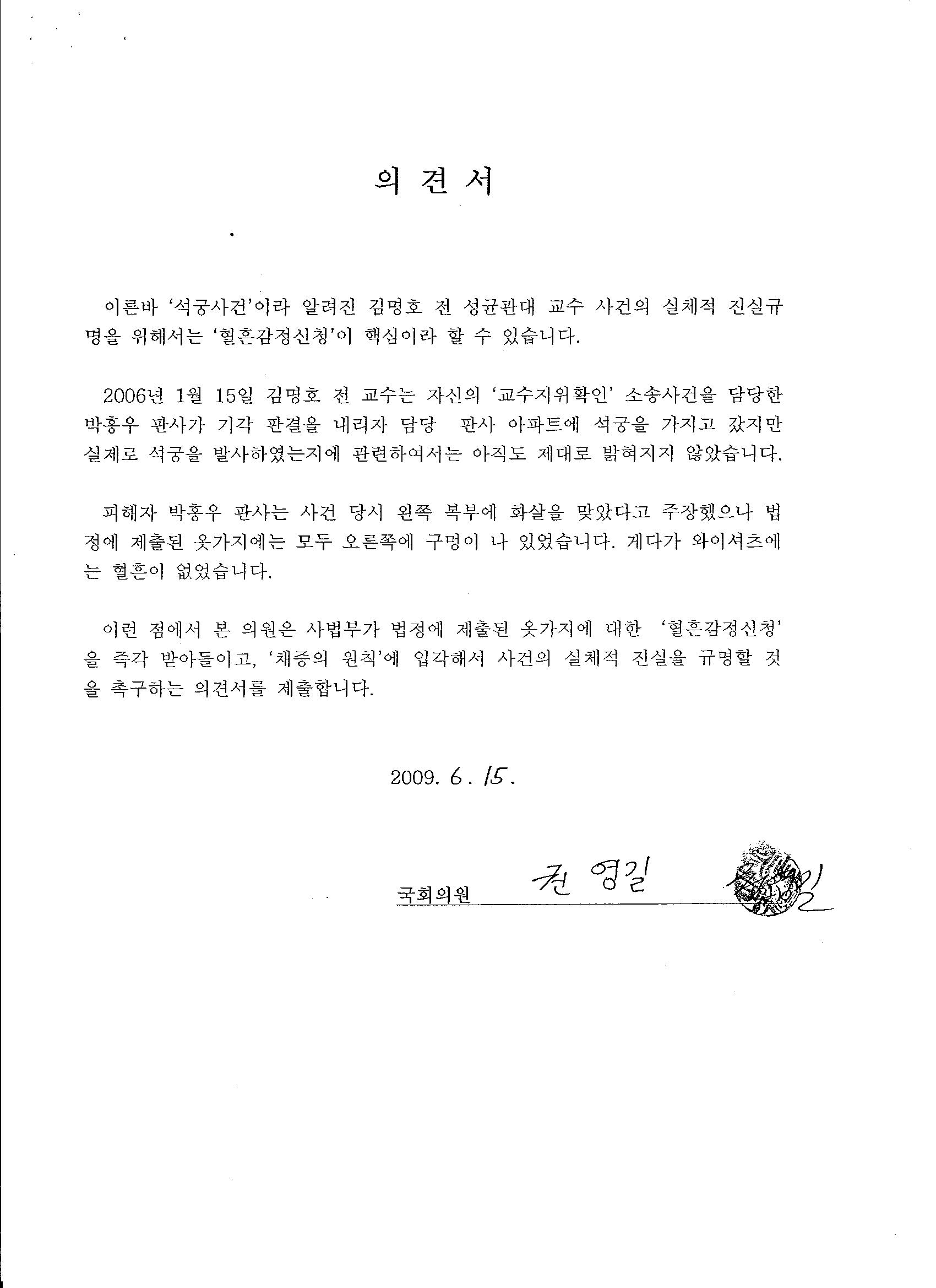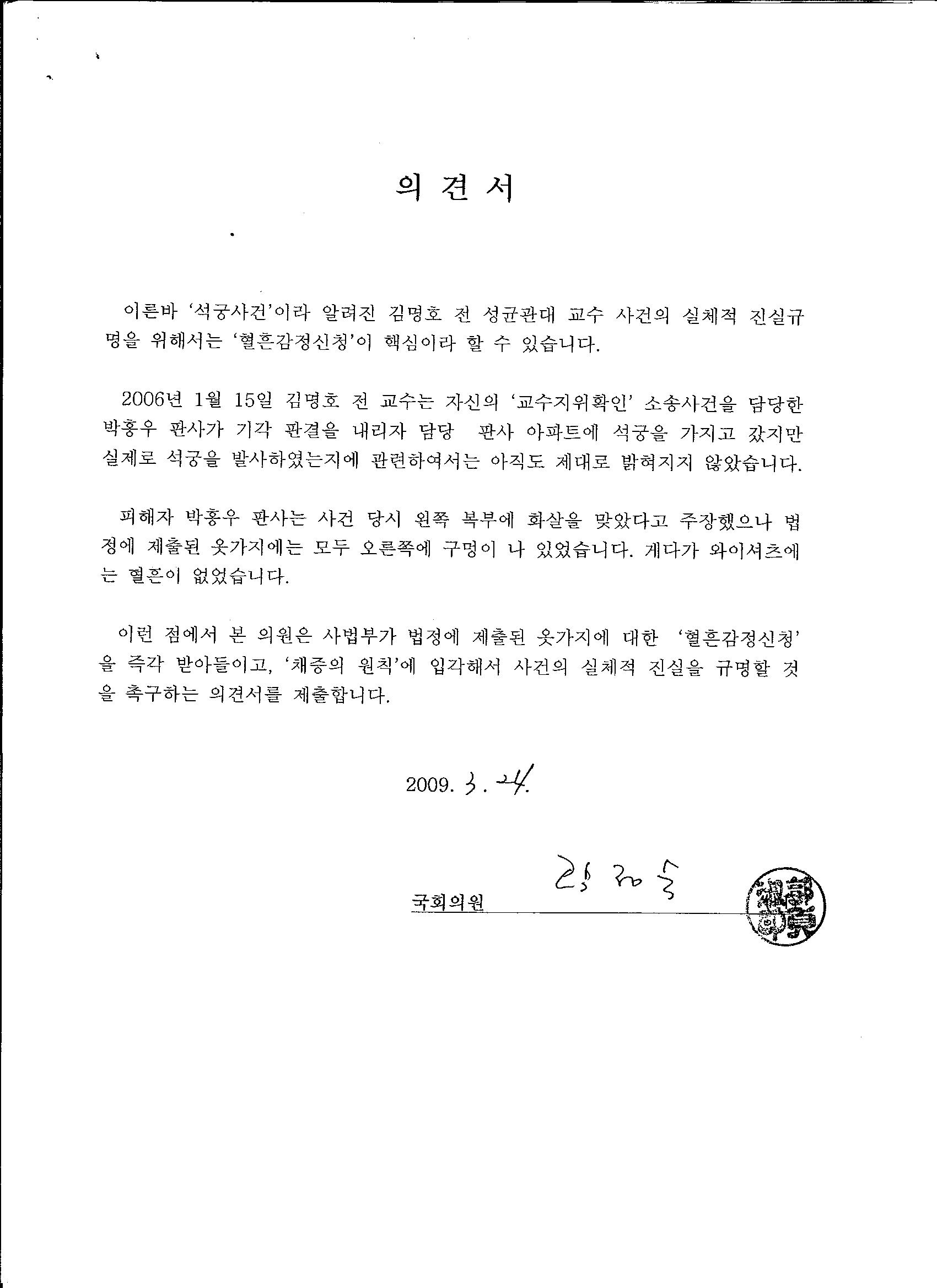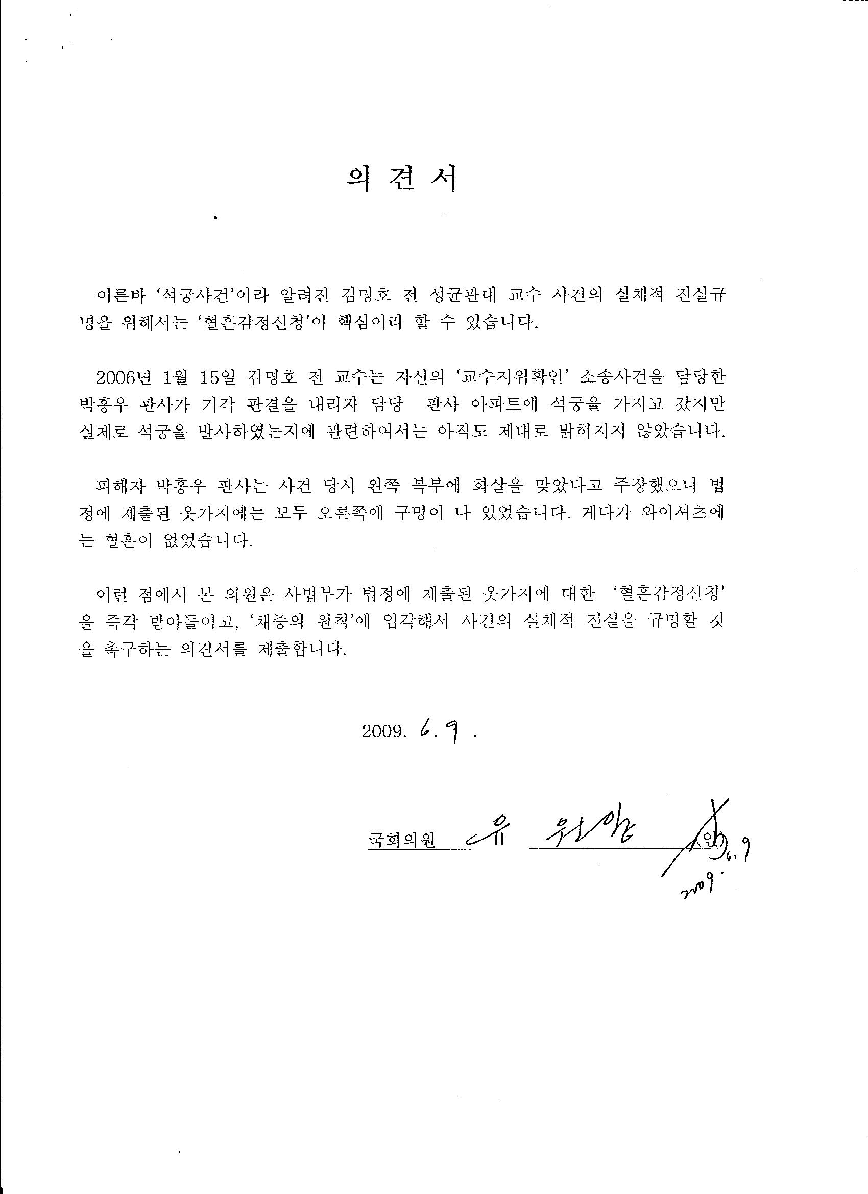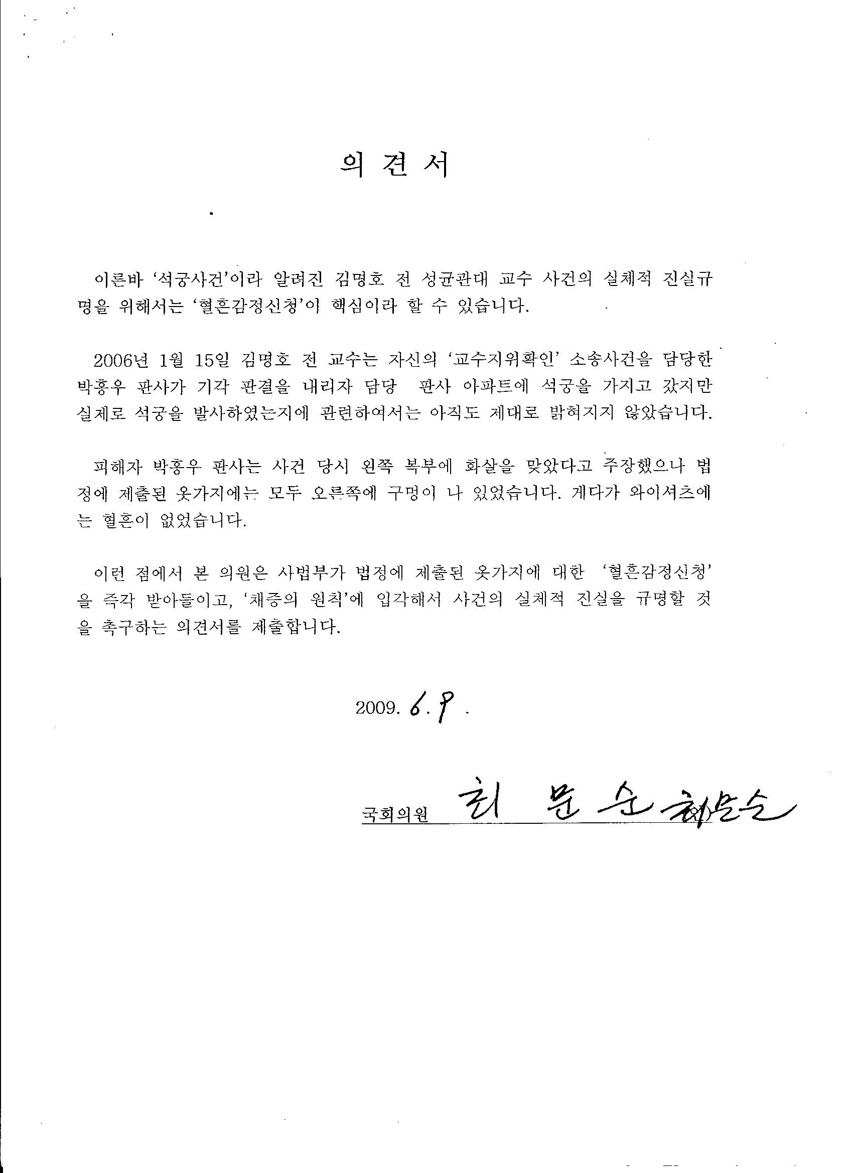 2009.06.16일 박홍우 옷가지 혈흔과 박홍우 피 일치 여부에 대한 혈흔 검증 촉구 의견 서명서를