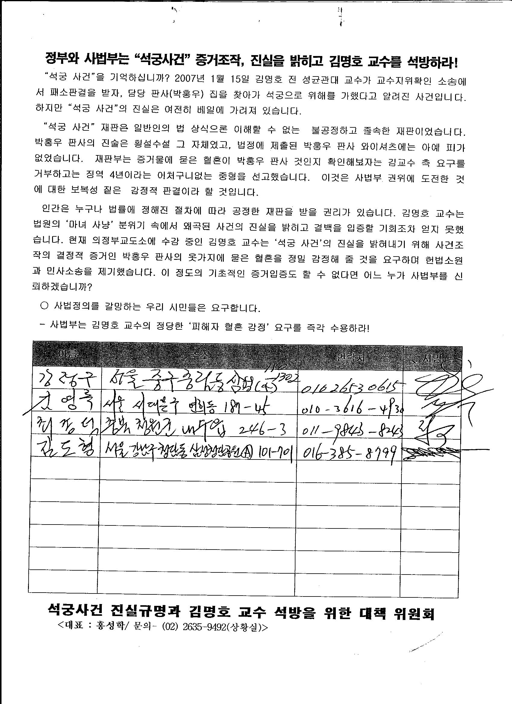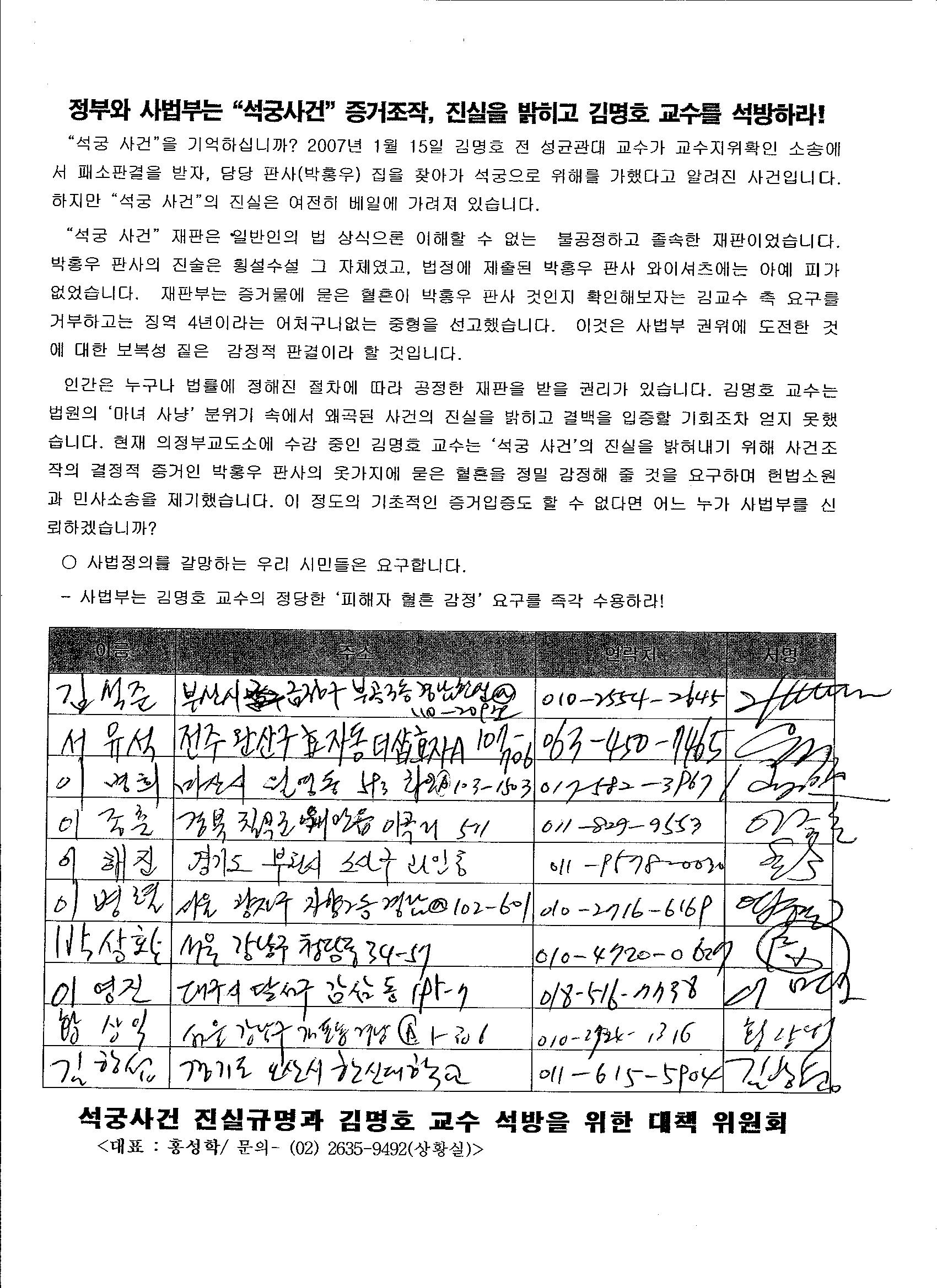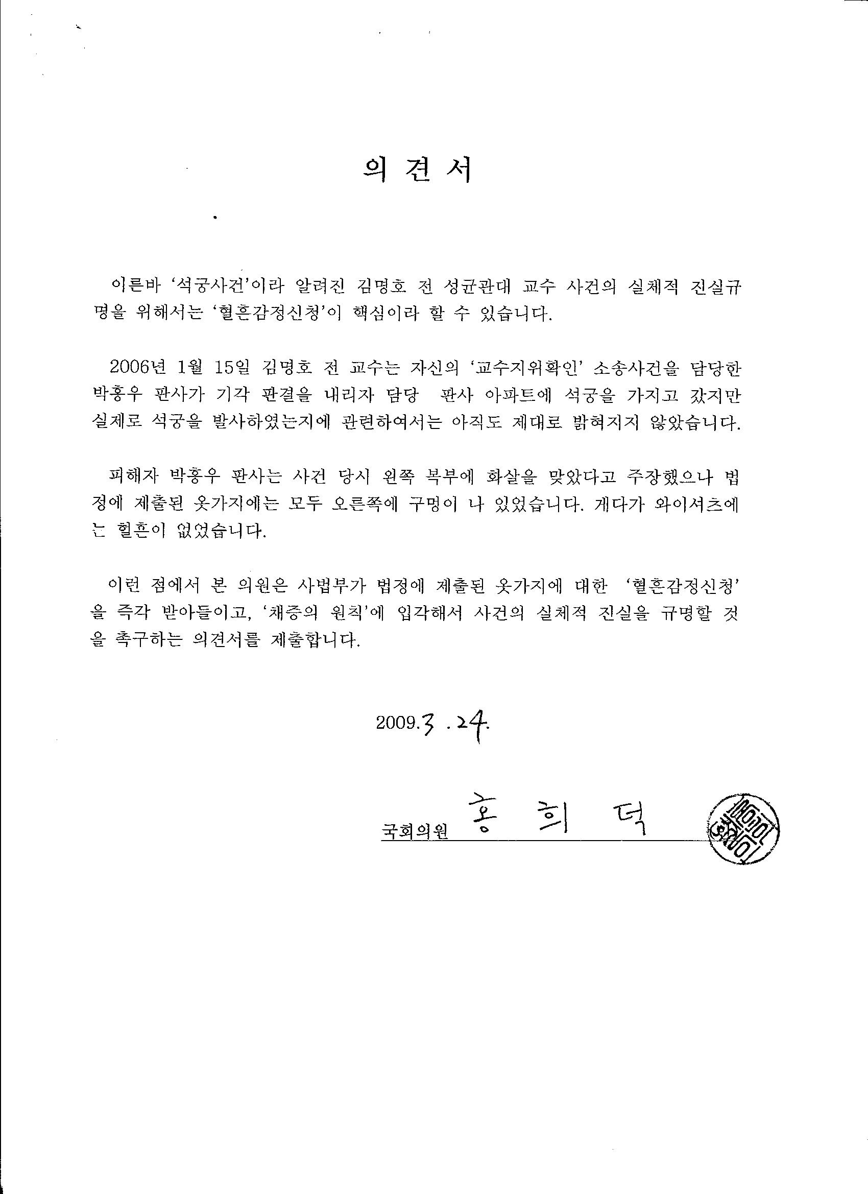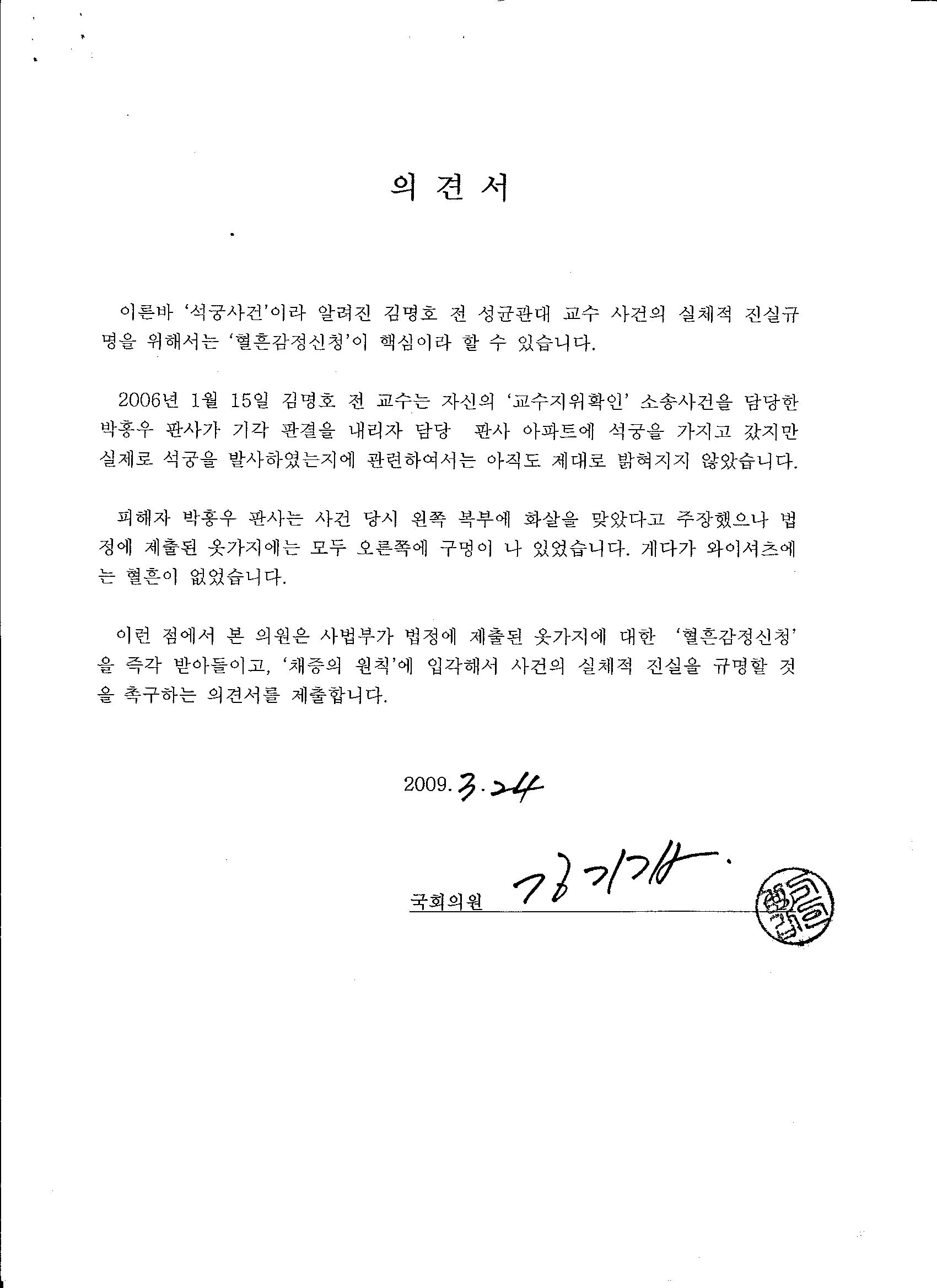 2009.06.16일 박홍우 옷가지 혈흔과 박홍우 피 일치 여부에 대한 혈흔 검증 촉구 의견 서명서를