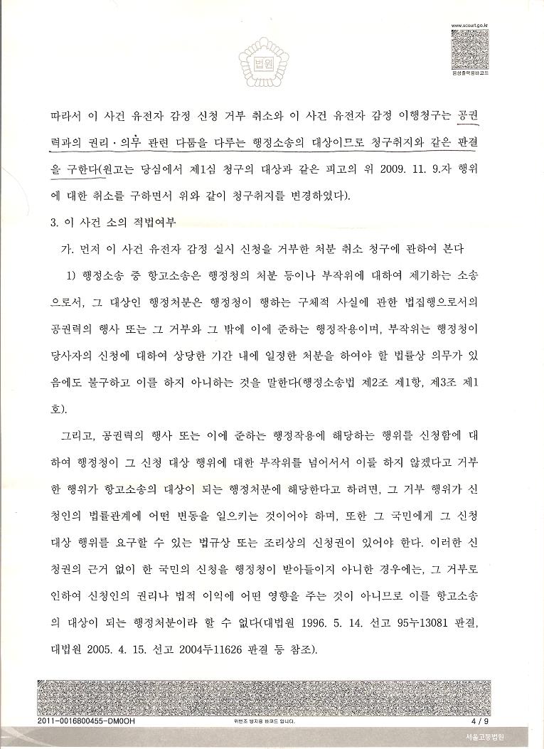 또는 조리상 신청권이 인정된다고 보기 어렵다"며 "김명호씨가 유전자 감성을 실시하도록 요구할 수 있는 신청권이 없는 이상