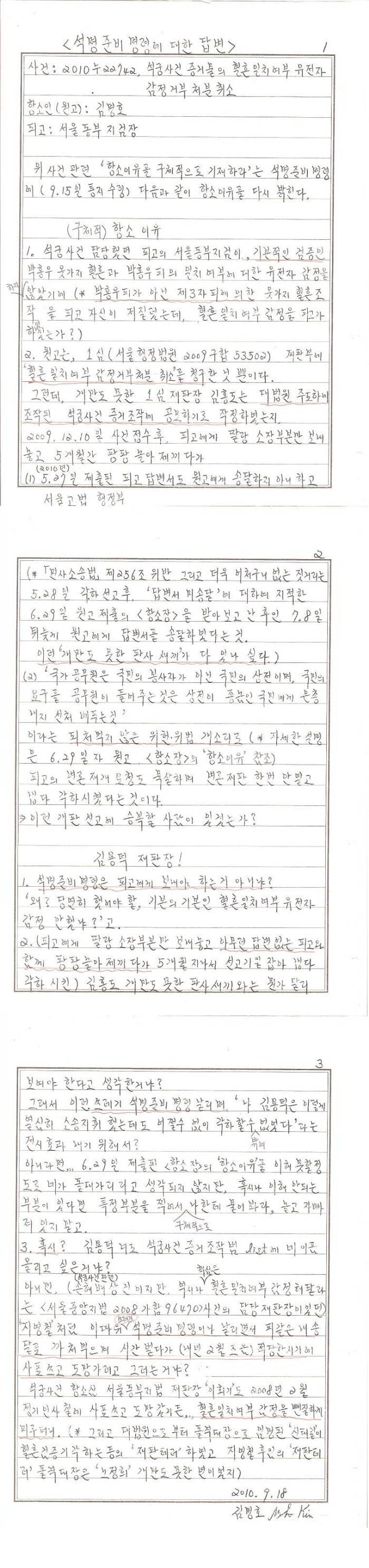 2010. 10. 22 원고 김명호 석명준비멸령 신청 제출